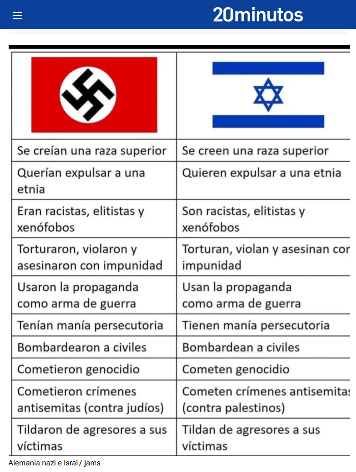 El artículo de opinión del diario digital 20 Minutos titulado «Judíos justos claman contra el genocidio de Israel en Gaza», incluye una comparativa entre Israel y el régimen nazi.