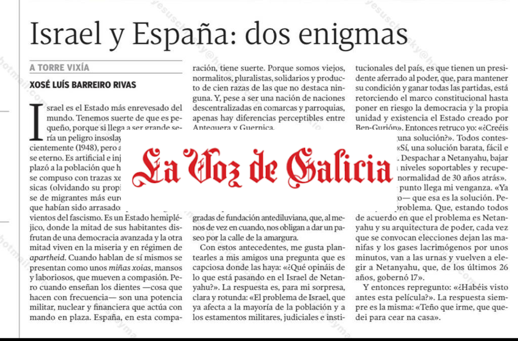 La Voz de Galicia publicó el día 16 de septiembre un artículo firmado por Xosé Luís Barreiro Rivas en el que compara la situaciones políticas de España e Israel y califica a Israel como país artificial, injusto, sin historia, enrevesado, xenófobo, hemiplégico, afortunadamente pequeño y de apartheid.