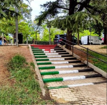 Bandera palestina pintada en las escaleras que llevan al parque Olof Palme, al lado de un colegio público en el distrito de Usera, al sur de Madrid.