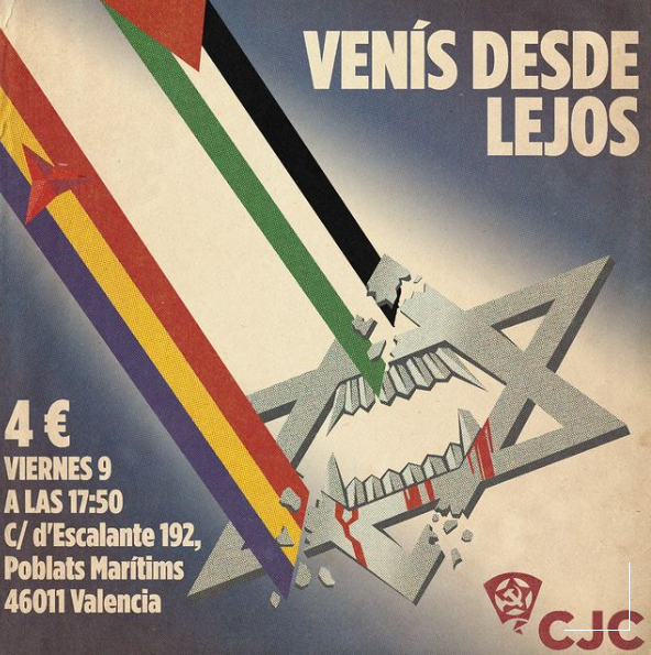 El cartel muestra una estrella de David con dientes y colmillos, destruida por una fuerza representada por la bandera palestina y otra por la bandera republicana española.