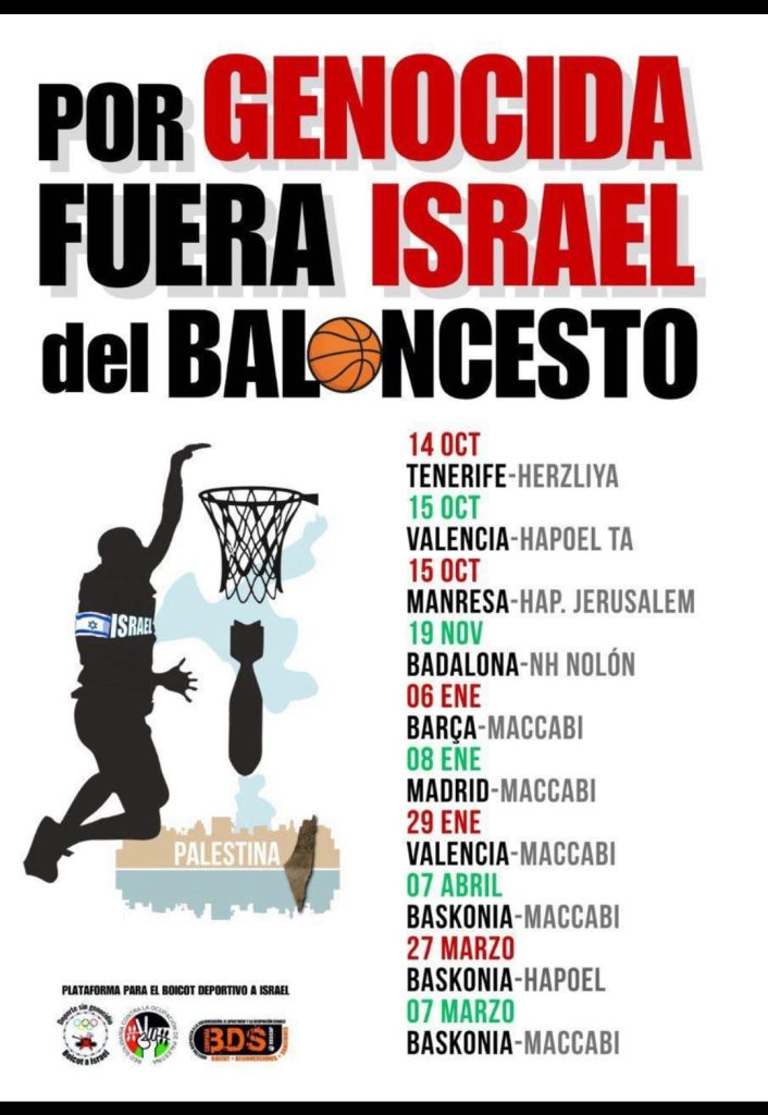 La plataforma para el boicot deportivo a Israel y el movimiento BDS, que presentan un mapa en el que Israel aparece borrado, llama al boicot contra varios partidos de baloncesto que enfrentan a equipos israelíes con españoles.