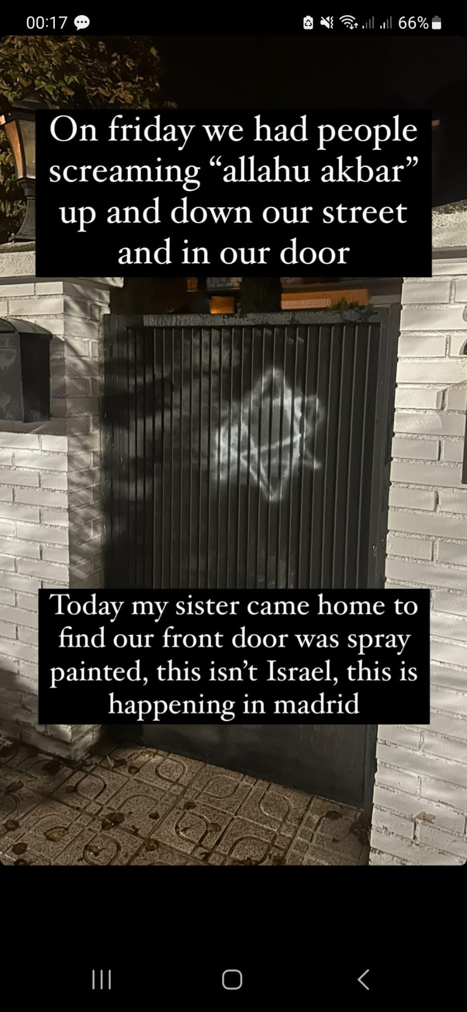 Pintada una estrella de David señalando la casa de una familia judía en Madrid el viernes 13 de octubre, 7 días después de la masacre perpetrada por Hamás en Gaza en la que asesinaron brutalmente a 1400 personas, secuestraron a 199 y causaron miles de heridos.