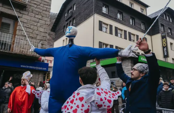 El Carnaval d´Encamp 2026 representó un acto teatral satírico que incluía el juicio público de un muñeco con la Estrella de David en la cabeza representando a Israel, y su posterior ahorcamiento y quema.