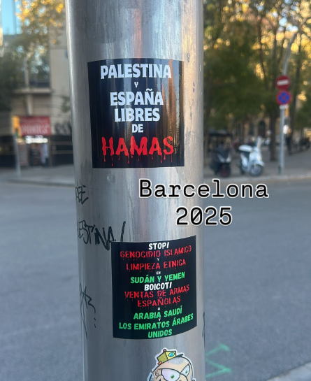 Carteles con el escrito «Palestina y España libres de Hamás», «Stop genocidio islámico y limpieza étnica en Sudán y Yemen. Boicot ventas de armas españolas a Arabia Saudí y los Emiratos Arabes Unidos»