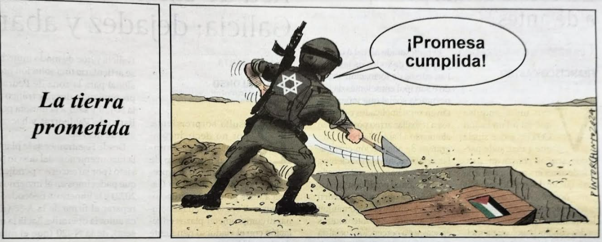 El Mundo ilustró el artículo titulado «La hora de los espías en la guerra de Gaza», firmado por la subdirectora del diario, con un dibujo que cuenta con varios ingredientes del antisemitismo clásico: el factor religioso, los símbolos del candelabro y la estrellas de David que identifican al pueblo judío y las armas que lo designan como colectivo violento.