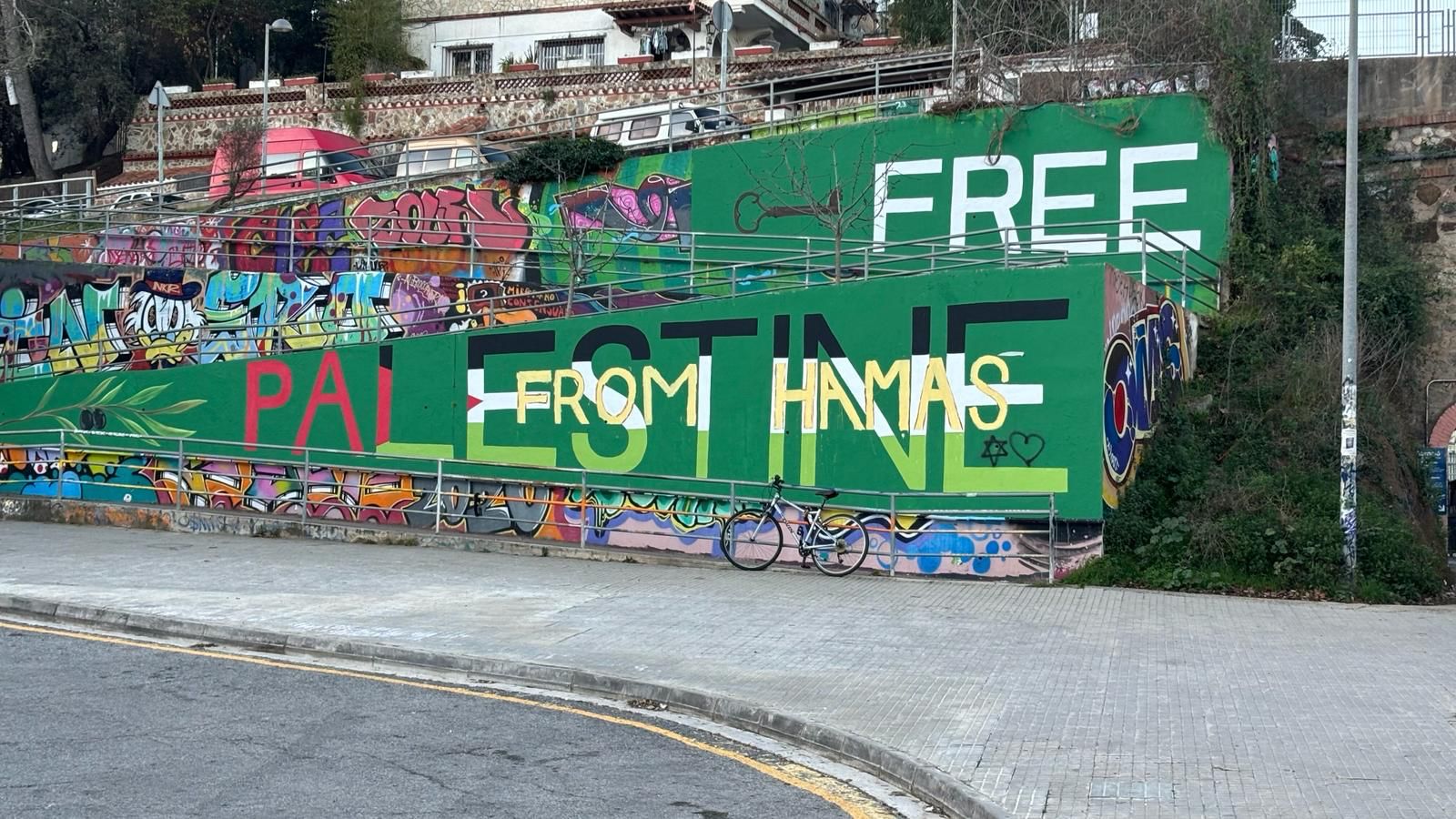 Se puede apreciar la bandera palestina, una mención a Hamás, una estrella de David con un agujero dentro y un corazón al lado.