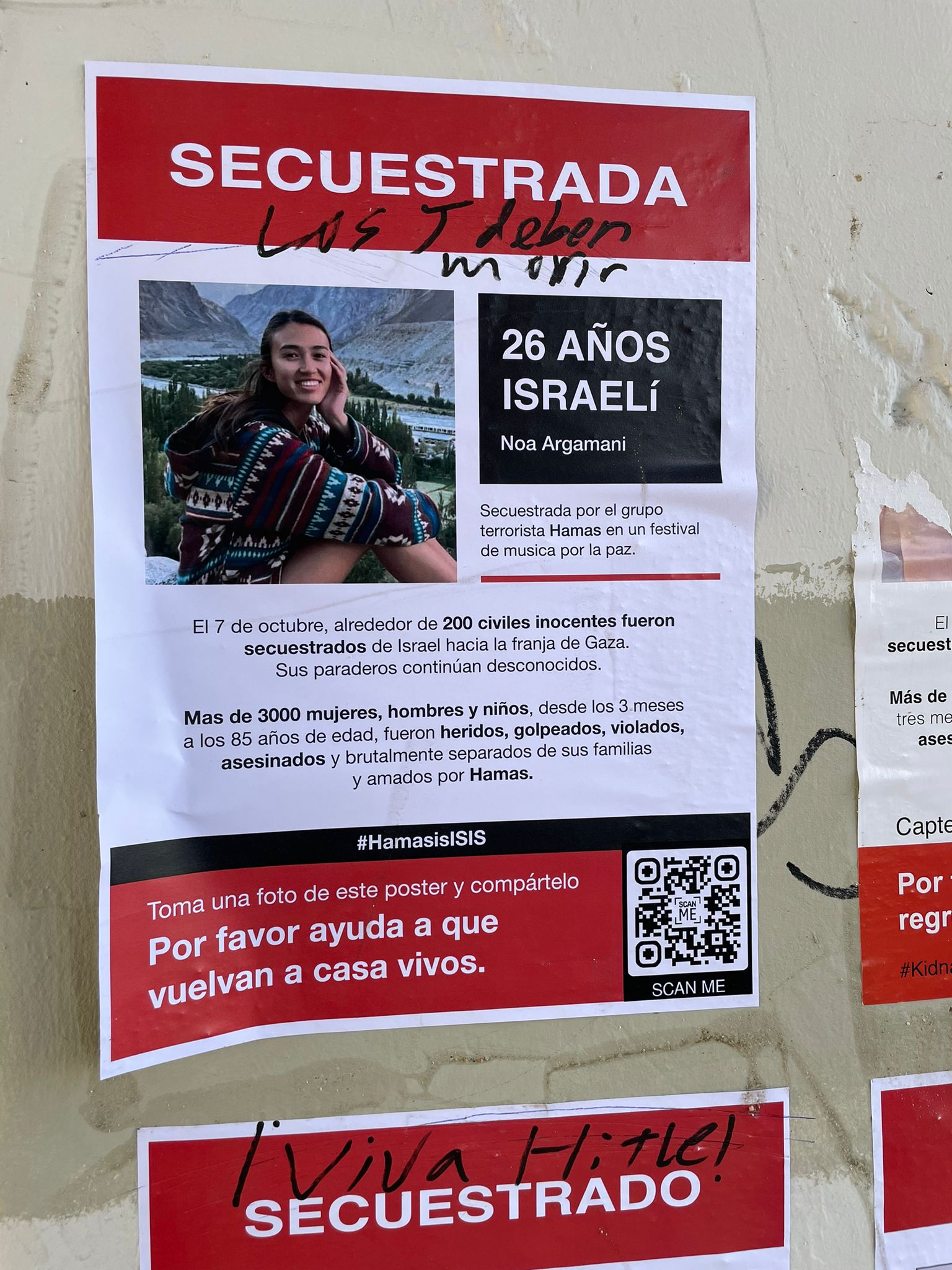 «Los judíos deben morir» y «viva Hitler» aparecieron en Alcobendas en un cartel de una mujer secuestrada por Hamás el día 7 de octubre.