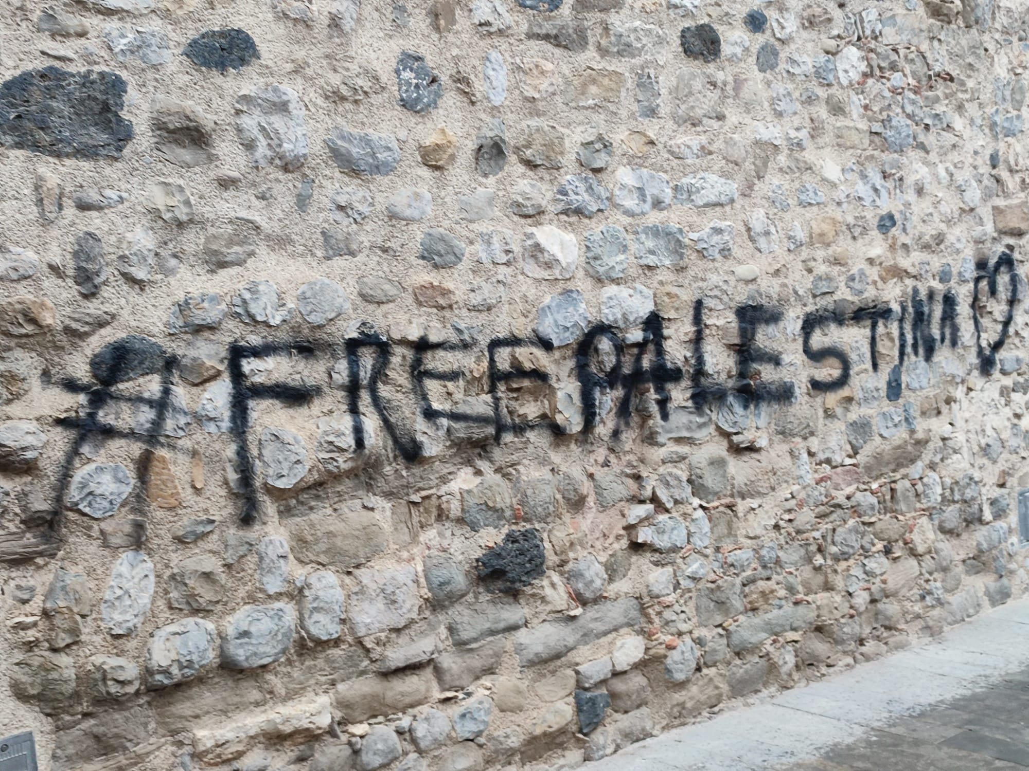 «Fee Palestina. No es guerra», «Fee Palestina» y un cartel explicativo sobre un símbolo judío tachado, aparecieron en el lugar donde estuvo la antigua sinagoga, el mikvé y la casa de una antigua familia judía.