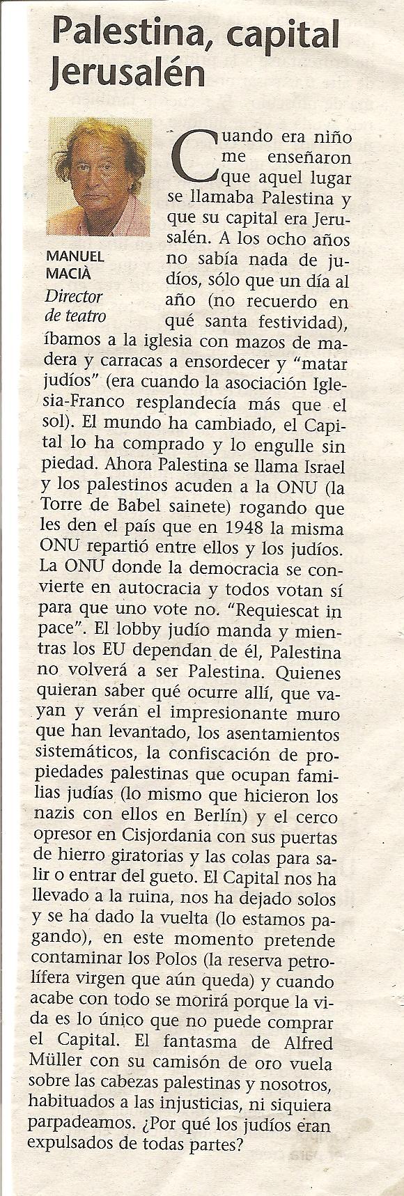 El periódico Última Hora de Palma de Mallorca ha publicado una columna escrita por Manuel Macía, titulada «Palestina, capital Jerusalén«.