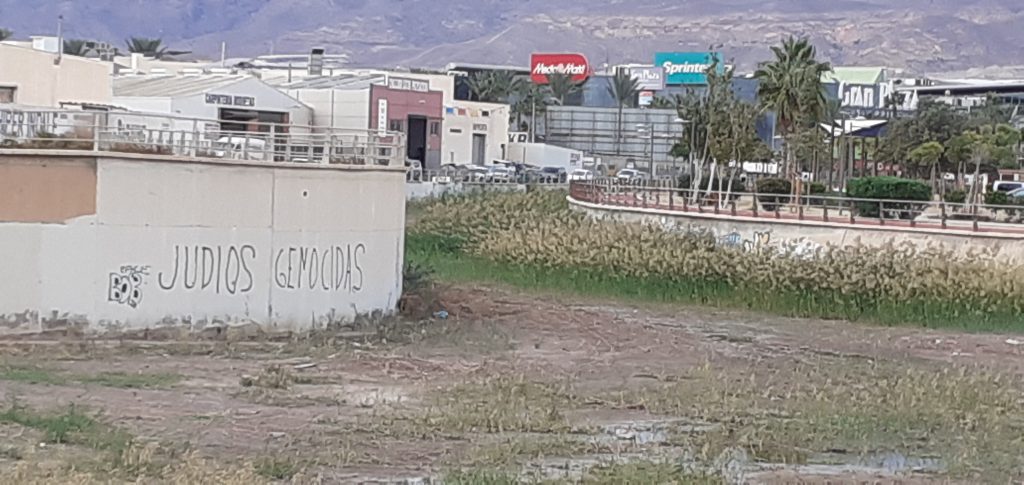 Pintada con el texto «judíos genocidas» en el muro de un colegio de educación infantil y primaria de Roquetas de Mar antisemitismo en españa, Pintadas Antisemitas