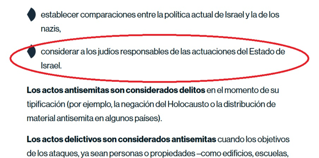 La definición de antisemitismo de la Alianza Internacional para el Recuerdo del Holocausto (IHRA), de la que España forma parte, pone como ejemplo de conducta antisemita «denegar a los judíos su derecho a la autodeterminación», que es lo que hace alguien que niega a Israel el derecho a existir.