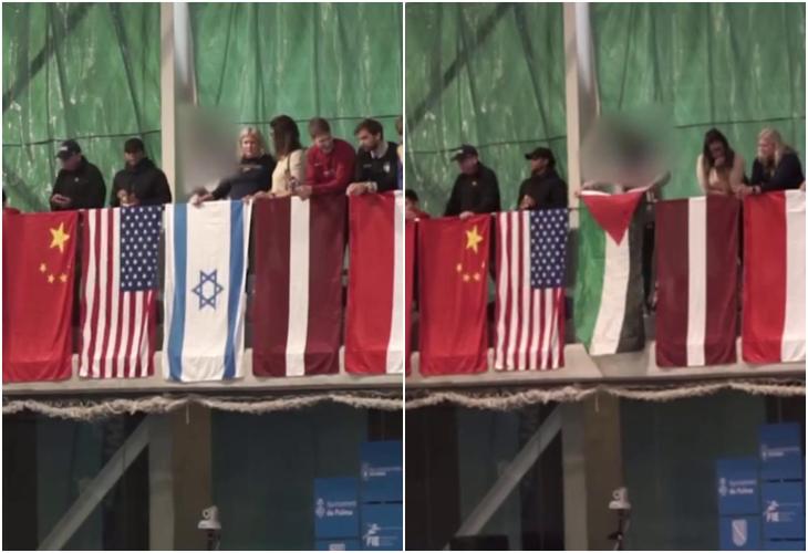 Un activista del grupo Ciutadans per Palestina (Baleares) cambió la bandera de Israel, cuyo equipo participaba en la Copa del Mundo de Florete (esgrima) en Palma de Mallorca, por la de Palestina.