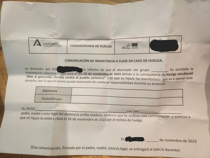 El día 10 de noviembre circularon documentos en al menos tres institutos de la provincia de Málaga llamando a la huelga estudiantil bajo el lema «Alto al genocidio sionista contra el pueblo palestino».