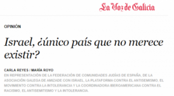 El día 27 de septiembre La Voz de Galicia publicó el artículo de opinión firmado por la Plataforma contra el Antisemitismo y otras entidades en respuesta al que el día 16 de septiembre publicó firmado por Xosé Luis Barreiro en el que demonizaba a Israel y cuestionaba su propia existencia.