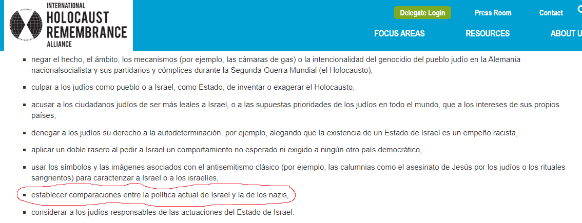 Según la Alianza Internacional para la Memoria del Holocausto (IHRA por sus siglas en inglés), comparar la política actual de Israel con la de los nazis, es antisemitismo: