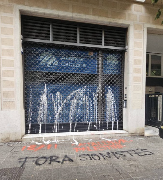 «Cataluña Palestina» y «Fuera sionistas» apareció pintado ante la fachada vandalizada de una sede del partido Alianza Catalana en Barcelona. Deslegitimación de Israel, partidos políticos, Pintadas Antisemitas