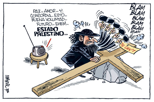 Utilización de una simbología religiosa antisemita: Recuperación del mito medieval del deicidio. Un personaje que reúne todas las características del arquetipo negativo del judío (nariz ganchuda, vestimenta hasídica, etc…) crucifica simbólicamente al nuevo Mesías Barak Obama, mientras da la espalda a la “paz, amor, concordia, buena voluntad” representados en el Estado Palestino.